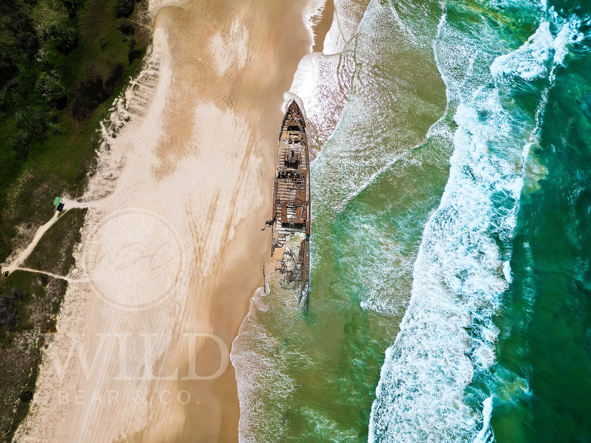 A stunning aerial photograph of The Maheno Shipwreck, K'gari (Fraser Island).