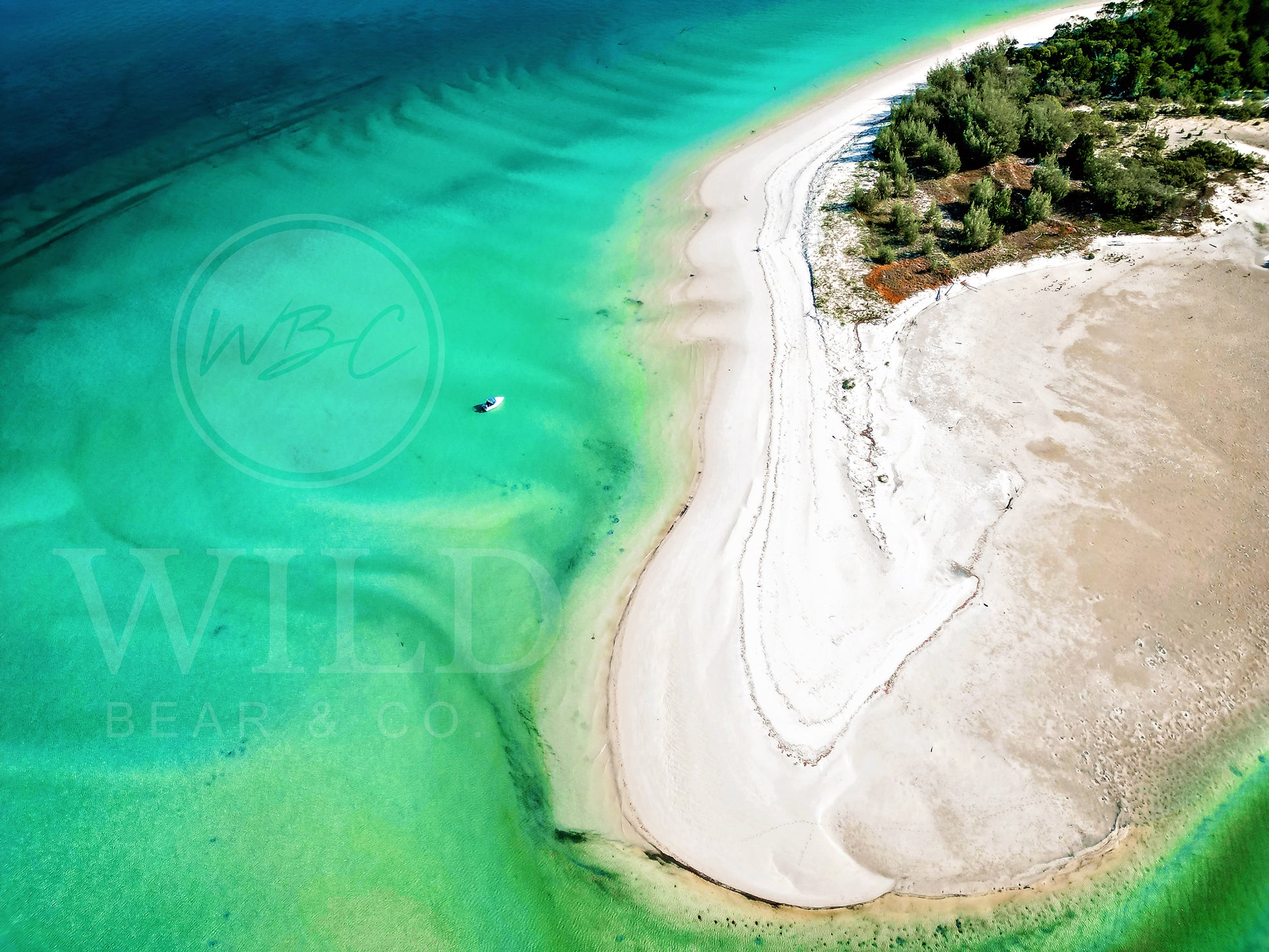 A stunning Queensland beach aerial shot, captured with the richness of our beautiful blue and teal waters, green trees and white & gold, sandy beaches.