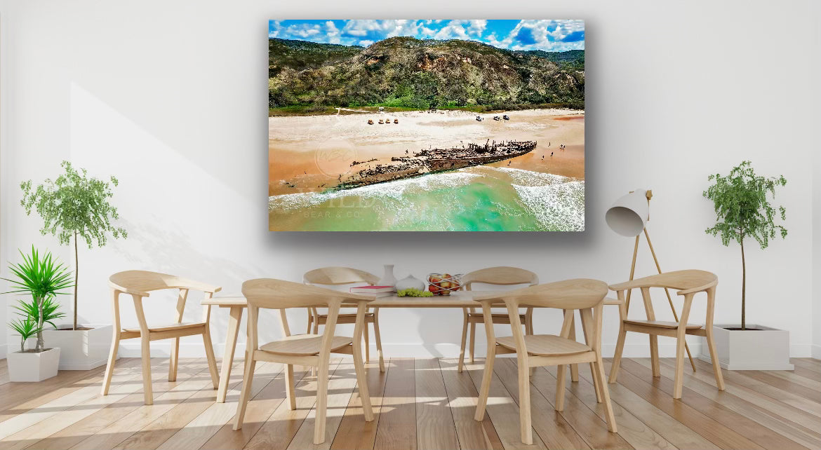A stunning aerial photograph of The Maheno Shipwreck, K'gari (Fraser Island).