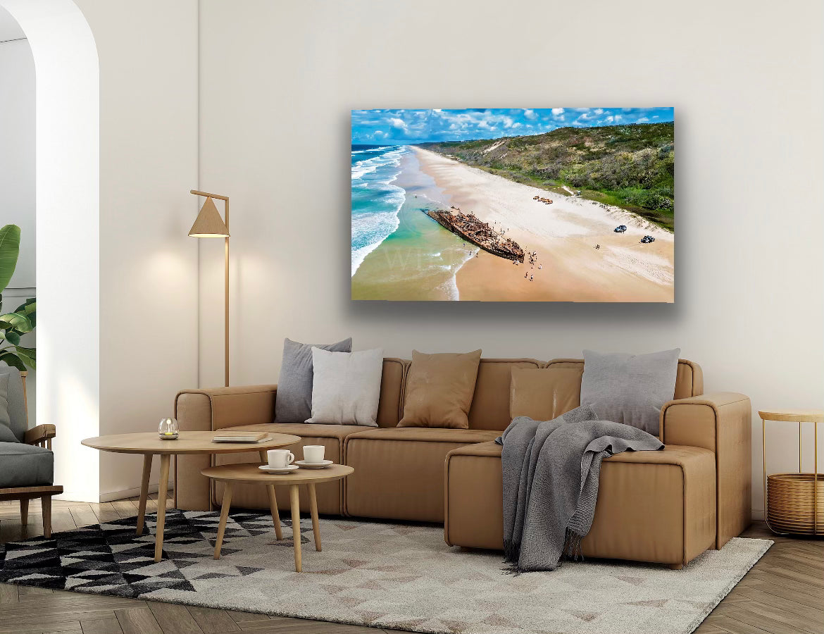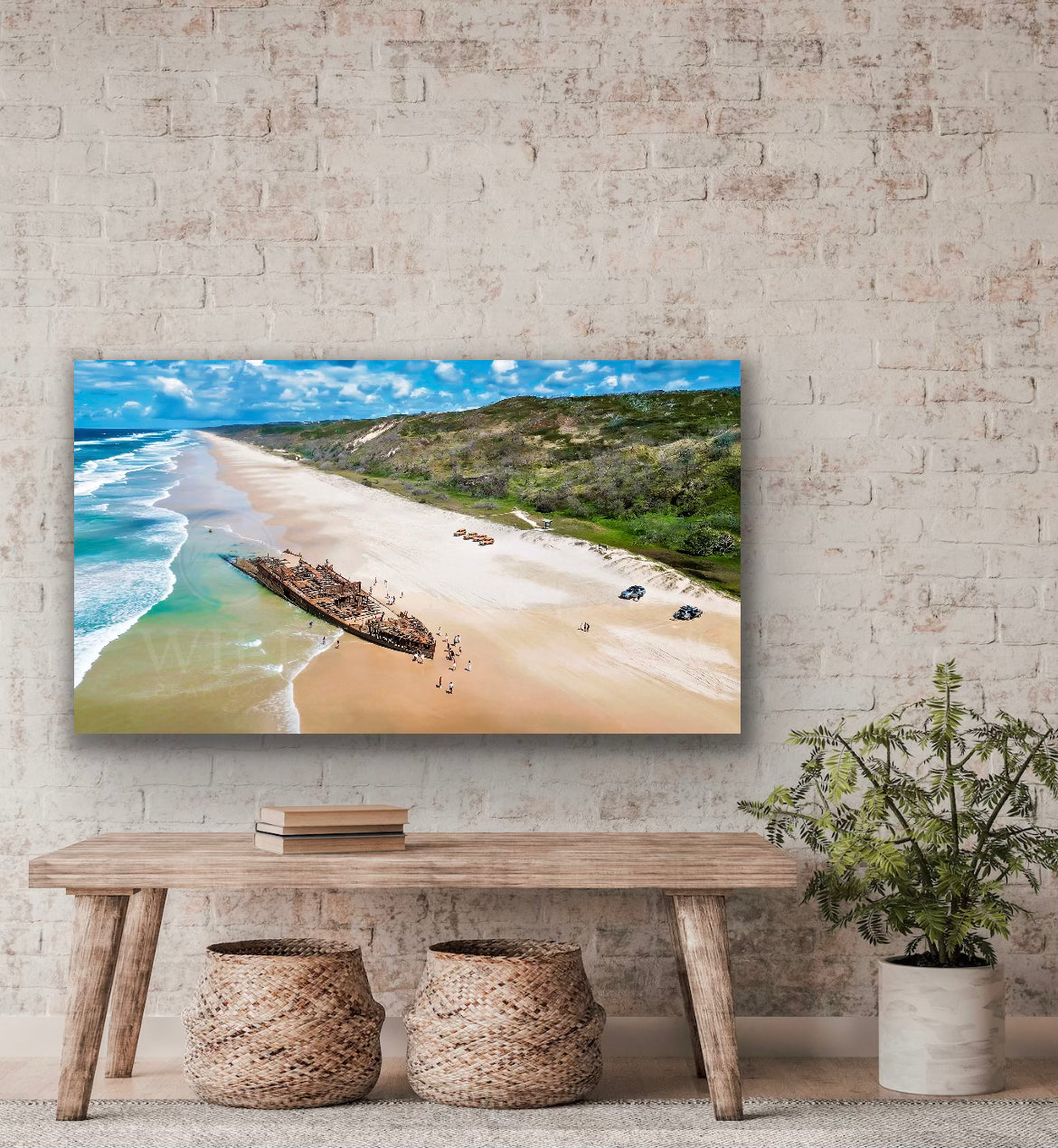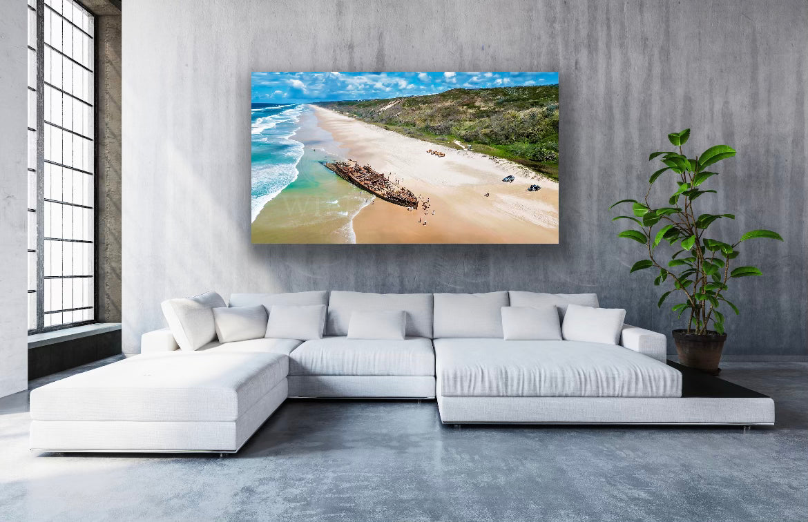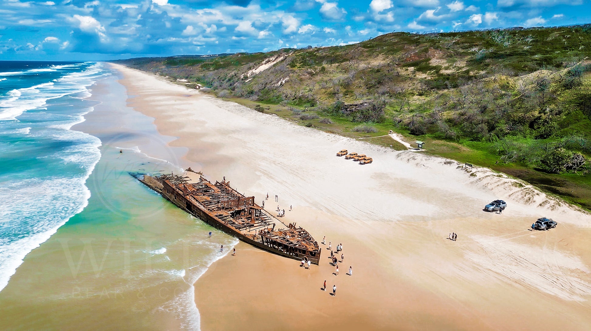 A stunning aerial photograph of The Maheno Shipwreck, K'gari (Fraser Island).